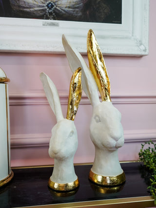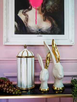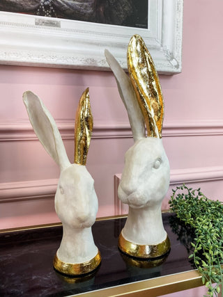 • This ultimate duo will bring some regal elegance to your decor! These two stunning hares have hopped straight out of an aristocratic fantasy, dressed to the nines in their glimmering gold accents. Perfect for adding a touch of majestic mayhem, these white and gold hares are here to class up your home. Position them on your mantelpiece for an air of mystery, or let them guard your bookshelves with their haughty elegance.They certainly are the hares of high society.