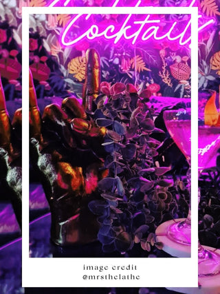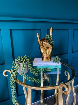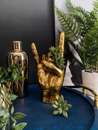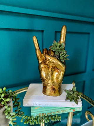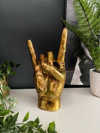 Add an instant fresh and funky update to your decor with this quirky 'rock on' sign vase. A show stopping sculpture that brings something a little different that looks wicked with or without flowers. In a distressed antique gold finish that has a wonderful quality about it including some well manicured nails. For those that love a bit of rock and roll!
