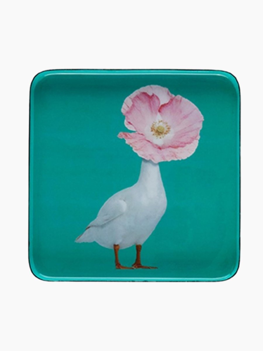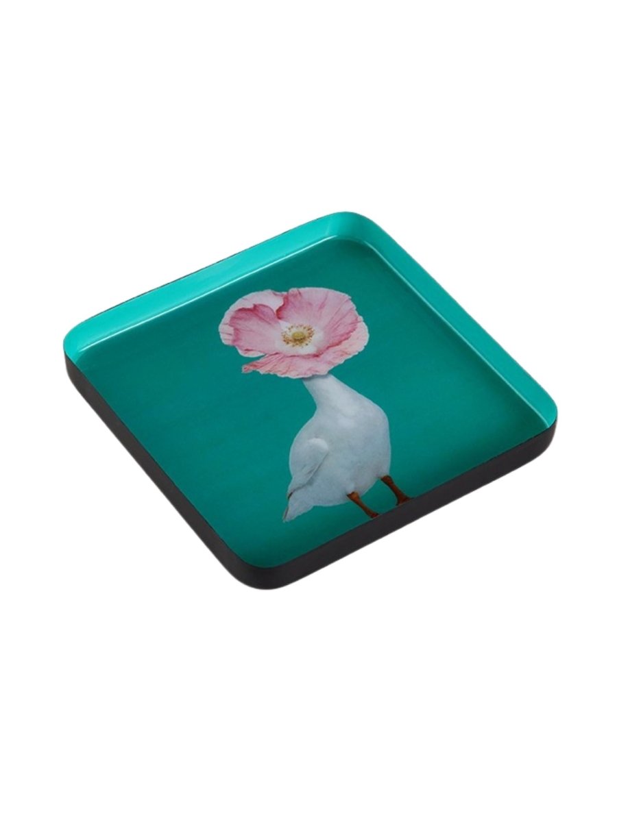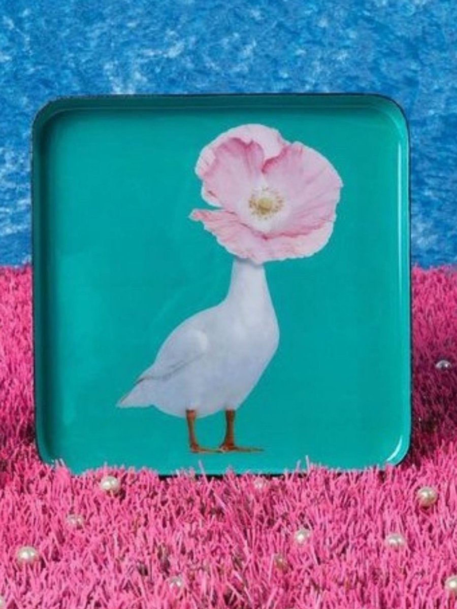 • What a beautiful duckling! This Gangzai Diva Square Trinket Tray with a turquoise enamelled background features a stunning pink flower on the body of a duck. This wonderfully quirky dish will add glamour and fun to your sideboard or dressing table.