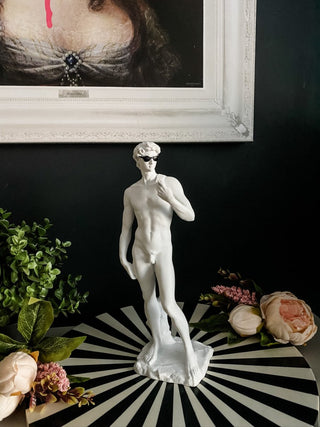 Imagine Michelangelo's David, but with a dash of playful pizzazz. Our Cool Dave isn't just any old statue – he's a replica with a quirky twist that's sure to turn heads and spark conversations.This resin coloured daredevil sports a pair of sleek, oversized sunglasses that make him look like he's ready for a stroll down a Milanese runway. He's the ultimate fusion of Renaissance elegance and contemporary style. Infuse a touch of Italian flair and a whole lot of fun into your decor with Cool Dave – because who said classics can't have a blast?