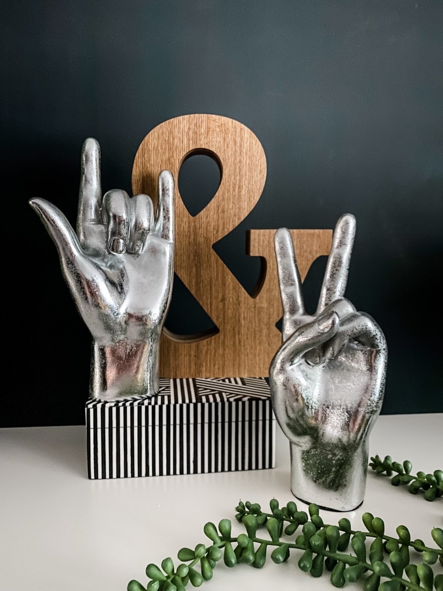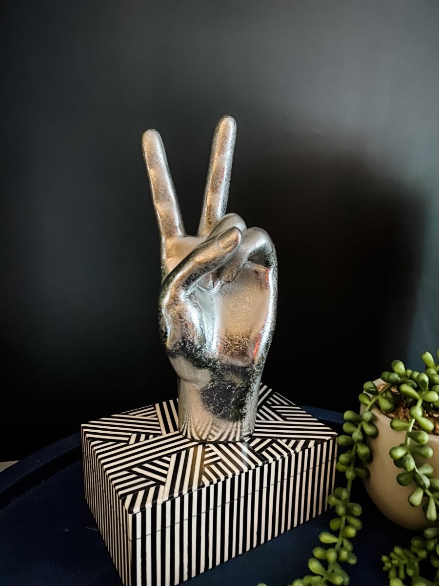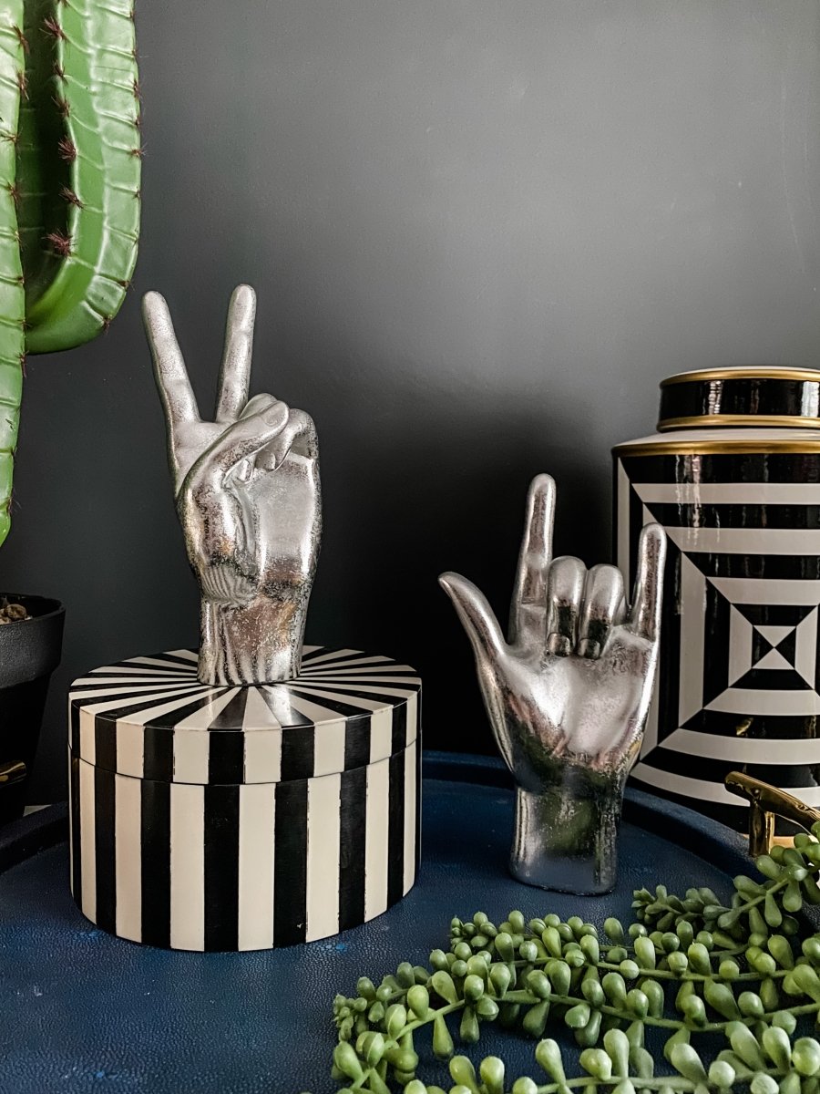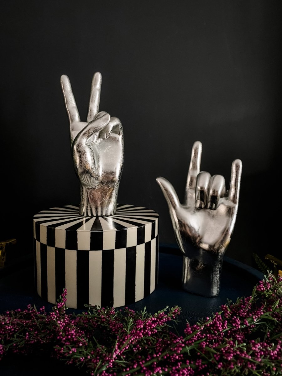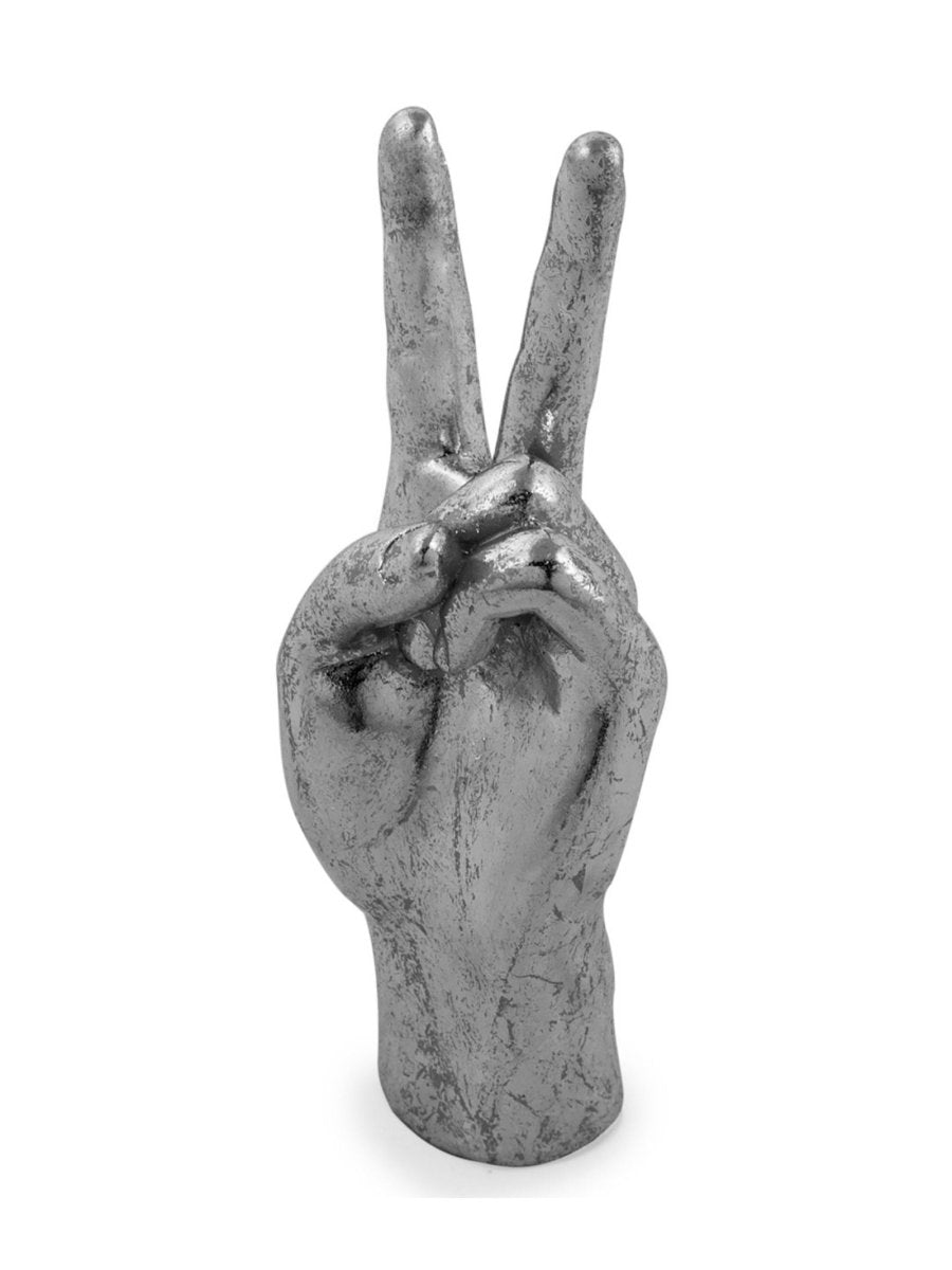 We absolutely adore our hand gesture figures that are an easy way to give your interiors a fresh and funky update without breaking the bank. This fun Silver 'Peace' Hand Ornament will add instant quirkiness to your décor. Display it by itself or why not use it as a vignette or to hang your favourite jewellery on. Finished in a distressed metallic silver.
