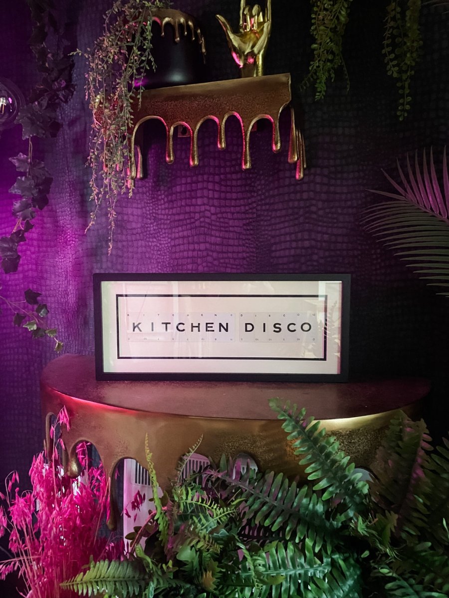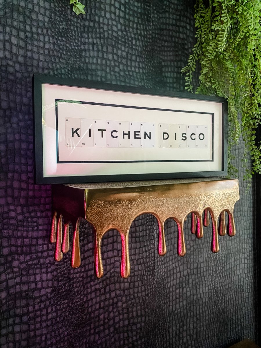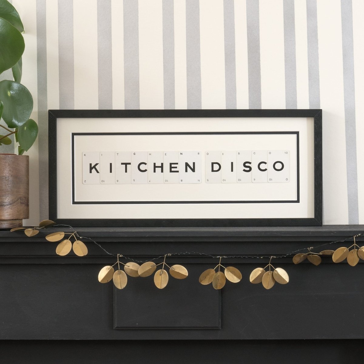 Featuring individual vintage playing cards sourced from a 1930s spelling game, this wall art meticulously spells out the phrase 'Kitchen Disco.' The cards are thoughtfully arranged on a dual-toned cream and black mount and presented in an elegant black box frame with added hooks for easy hanging.