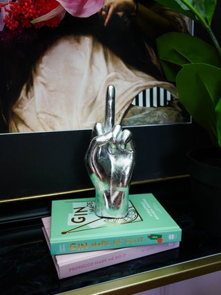 We absolutely adore our hand gesture figures that are an easy way to give your interiors a fresh and funky update without breaking the bank. This bold Silver 'Middle Finger' Hand Ornament will add instant edginess to your décor. Display it by itself for a cheeky statement piece or use it as a unique holder for your favorite jewelry. Finished in a distressed metallic silver, it’s perfect for adding a touch of rebellious charm to any space.